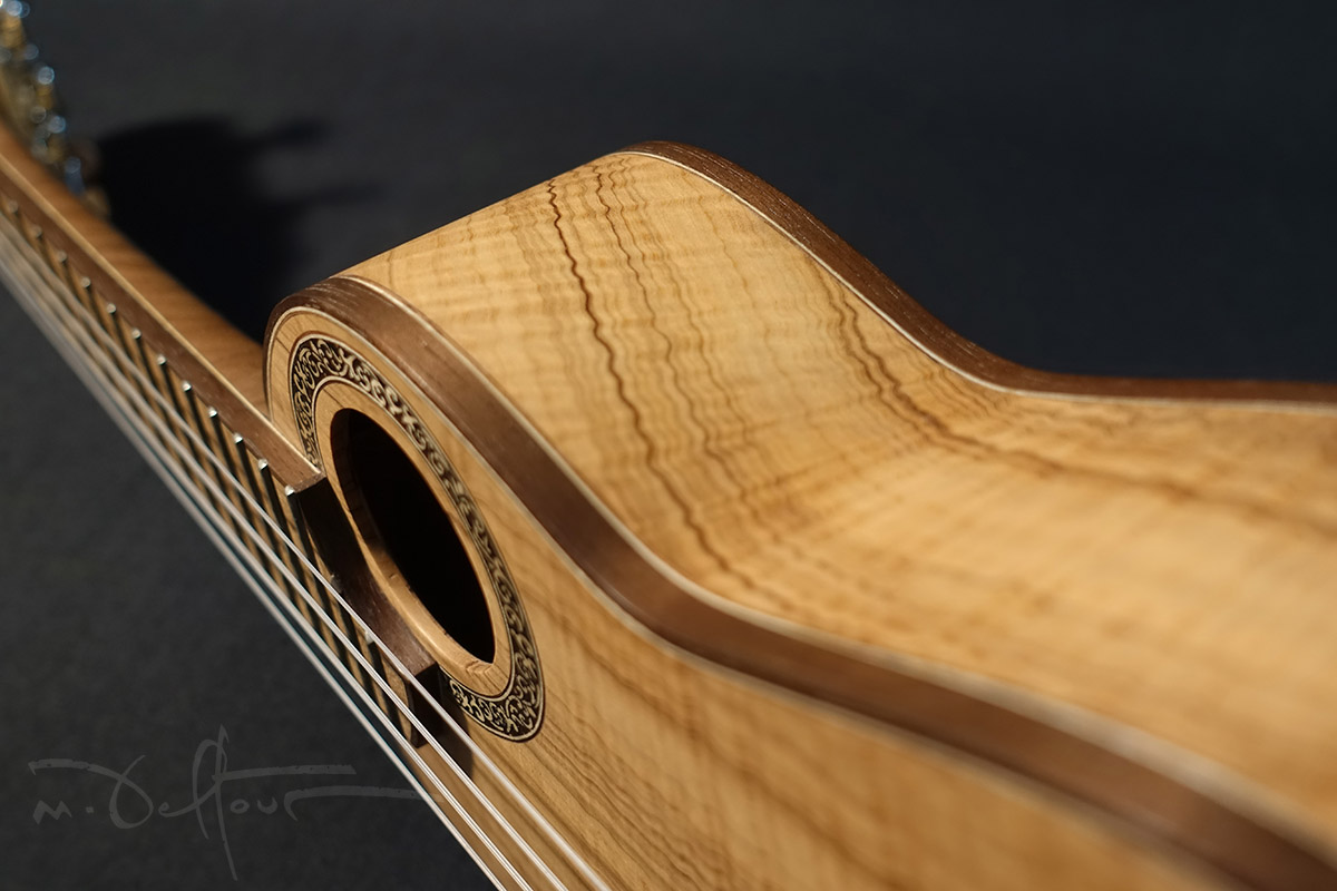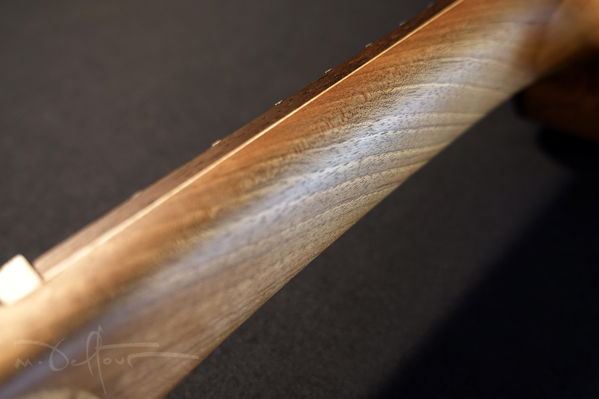 Bindings: Peruvian Walnut bindings with walnut and white purflings. Purflex rosette and end graft