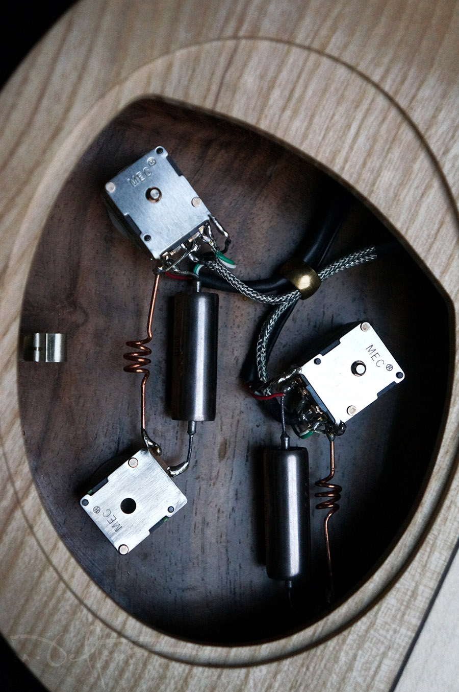 Electronics: 2 volumes, 2 tones + coil split, Gibson 3 way switch, MEC pots, vintage russian 0.022 paper in oil capacitors, switcraft jack